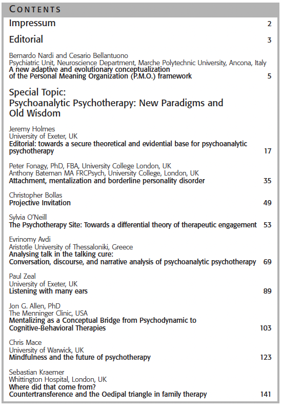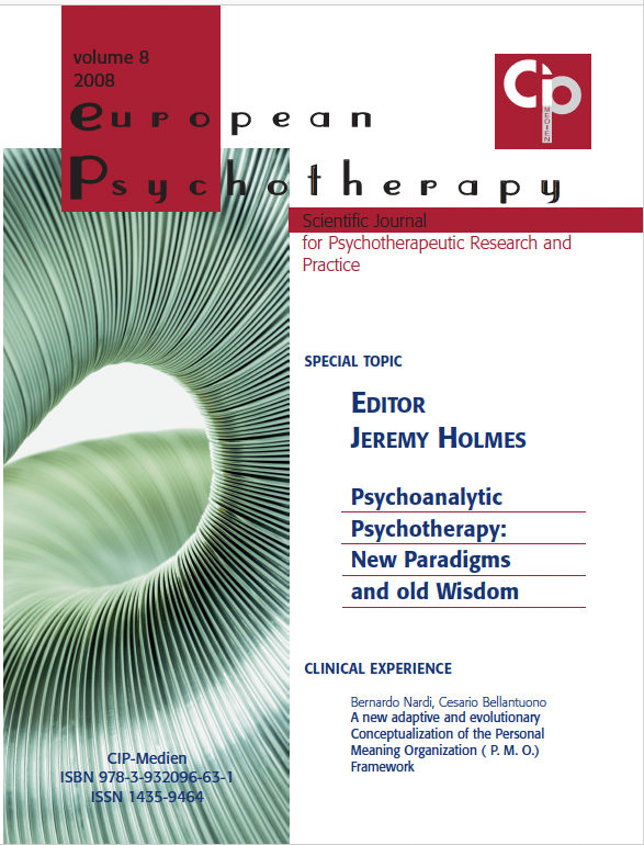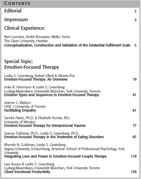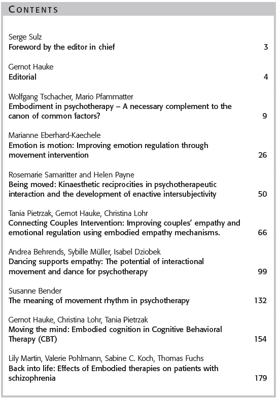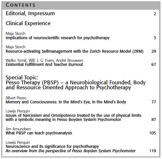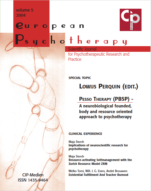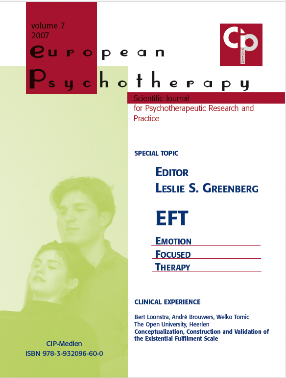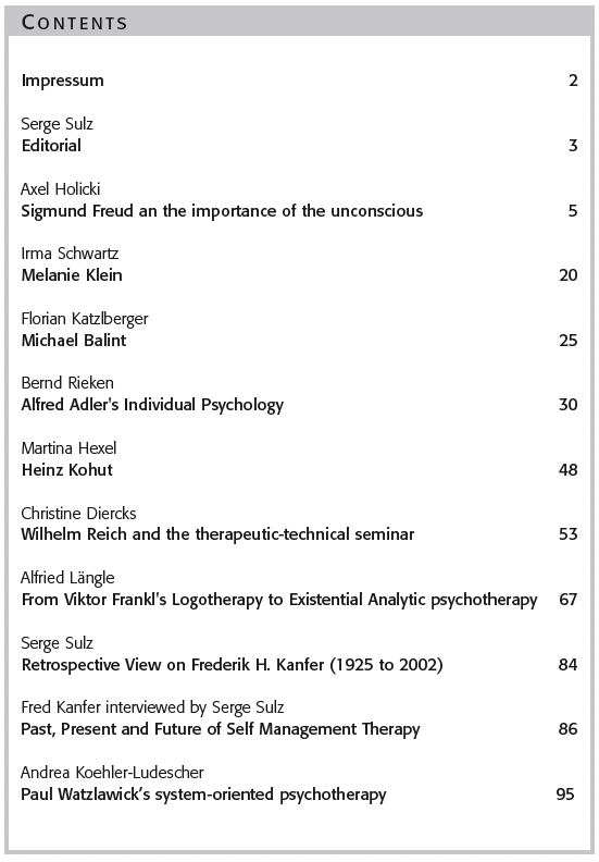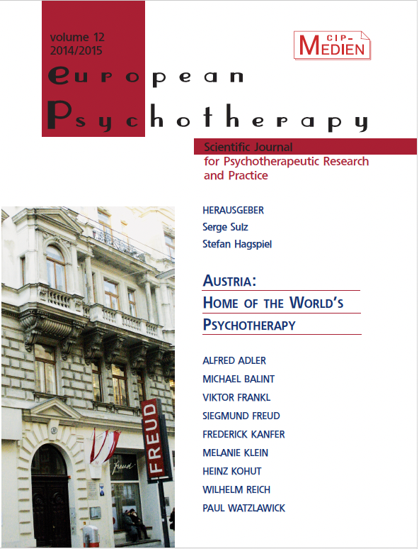 Former Issues of EUROPEAN PSYCHOTHERAPY2016/2017: Embodiment. Editor: Gernot Hauke2014/2015: Vienna and Austria: Home of Worlds Psychotherapy Editors: Serge K. D. Sulz, Stefan Hagspiel2012/2013: Concentrative Movement Therapy. Editor: Anke Hamacher-Erbguth2011: Psychotherapy in Europe. Editors: Serge K. D. Sulz, Stefan Hagspiel2010: Presence and Future of Behavior Therapy. Innovative approaches give the direction. Editors: Gernot Hauke, Serge K. D. Sulz2008: Psychoanalysis – New Paradigms and old Wisdom. Editor: Jeremy Holmes2007: Emotion Focused Therapy. Editor: Leslie S. Greenberg2006: A 3rd Wave Therapy in Europe: Strategic Brief Therapy. Editors: Gernot Hauke, Serge K. D. Sulz2004: Pesso Therapy (PBSP) Editor: Lowijs Perquin2003: Existential Analysis. Editor: Alfried Längle2002: Posttraumatic Stress Disorder. Editor: Willi Butollo and Coworker2001: Davanloo‘s Intensive Short-Term Dynamic Psychotherapy. Editor: Habib Davanloo